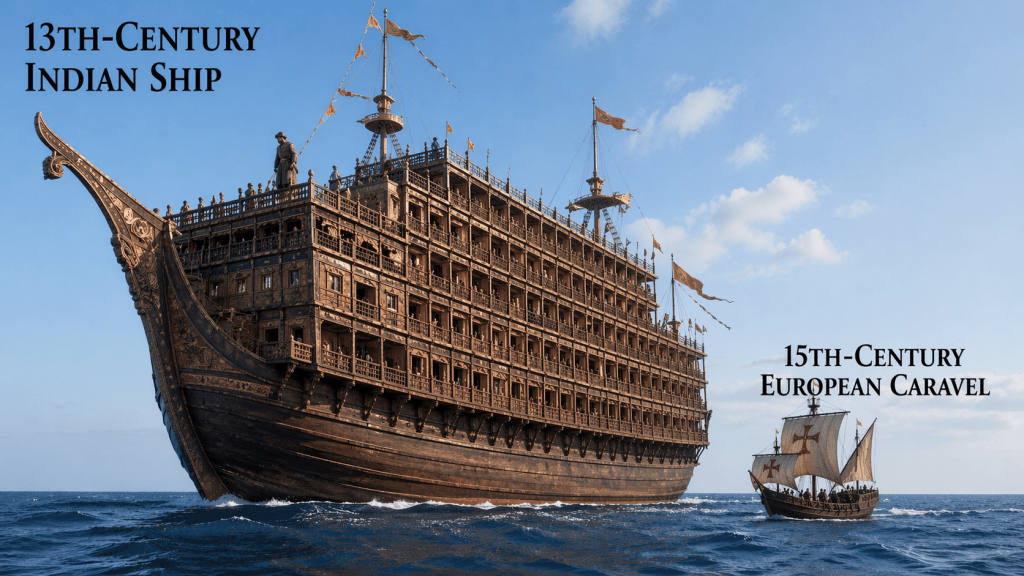 Polo describes ships approaching eighty metres in length. Columbus’s Santa María was nineteen metres. Indian ships were four times the size, with watertight compartments that European shipbuilders would not independently develop for another five centuries. Polo returned to Europe in 1295 and was called a liar for decades. The Indian ships were simply too large to believe.